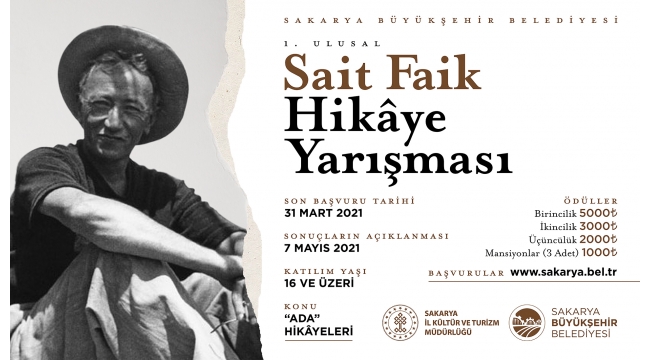 Büyükşehir Belediyesi ile İl Kültür Turizm Müdürlüğü işbirliğinde Adapazarı’nda dünyaya gelen ve öykücülüğü ile Türk Edebiyatında önemli bir yer edinmiş olan Sait Faik Abasıyanık’ın anısına 1. Ulusal Sait Faik Hikâye Yarışması düzenleniyor. Dereceye girenlerin ödüllendirileceği yarışmanın son başvuru tarihi 31 Mart Çarşamba. Yarışmanın detaylı bilgileri ise www.sakarya.bel.tr adresinde.