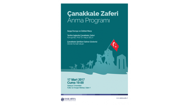 Sakarya Üniversitesi’nde Çanakkale Zaferi’nin 102. yıl dönümü dolayısıyla anma etkinliği düzenlenecek. 17 Mart Cuma günü sakarya Üniversitesi Kültür ve Kongre Merkezi’nde düzenlenecek olan programda, sakarya Üniversitesi Atatürk İlkeleri ve İnkılâp Tarihi Bölümü Başkanı Prof. Dr. Haluk Selvi ‘Tarihin Işığında Çanakkale Zaferi’ isimli bir sunum gerçekleştirecek.Programda, Sakarya Üniversitesi Devlet Konservatuvarı tarafından ‘Çanakkale Zaferi’ isimli bir dans gösterisi düzenlenecek.Tarihin Işığında Çanakkale ZaferiKonuşmacı: Prof. Dr. Haluk SELVİÇanakkale Şehitleri Sahne Gösterisi Devlet KonservatuarıYer : Sakarya Üniversitesi Kültür ve Kongre Merkezi, Salon 1Tarih: 17 Mart 2017 CumaSaat : 19.00