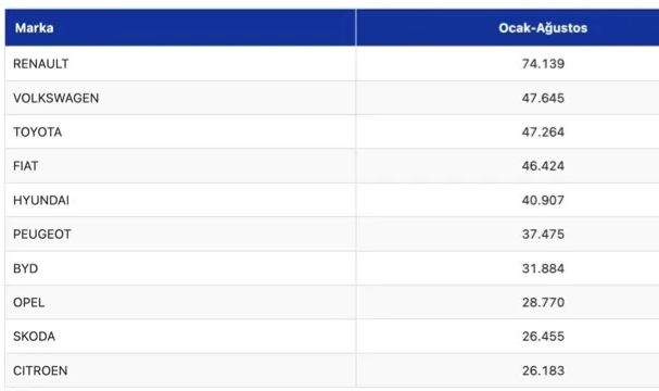 Türkiye'de ocak-ağustos döneminde toplam 654 bin 413 sıfır otomobil satışı gerçekleşirken, Renault bu dönemde toplamda 74 bin 139 satışla en fazla otomobil satan marka oldu.Türkiye otomotiv pazarında satışlar arttı Otomotiv Distribütörleri ve Mobilite Derneği (ODMD) verilerinden derlediği bilgilere göre, yılın 8 ayında Türkiye otomobil ve hafif ticari araç satışları geçen yılın aynı dönemine göre yüzde 7,24 artarak 817 bin 345 adet oldu.Otomobil satışları, söz konusu dönemde yüzde 8,05 artarak 654 bin 413'e çıkarken, hafif ticari araç satışları yüzde 4,1 yükselerek 162 bin 932'ye ulaştı.Türkiye yollarında Renault rüzgarı esti Yılın 8 ayında Türkiye’de marka bazında en çok satılan otomobiller listesinin ilk sırası değişmedi. Renault, bu dönemde toplamda 74 bin 139 satış gerçekleştirdi ve söz konusu dönemde pazar payı yüzde 11,3 olarak hesaplandı. Aynı dönemde marka bazında satışlarda ikinci sırada 47 bin 645 ile Volkswagen bulunurken, 47 bin 264 ile Toyota listede üçüncü sırada yer aldı. Bu dönemde Fiat 46 bin 424 satış yaparken, Hyundai 40 bin 907, Peugeot 37 bin 475 otomobil sattı.Model bazında Clio önde Yılın 8 ayında model bazında en çok satılan otomobiller listesinin ilk sırasında da Renault Clio yer aldı. Aynı dönemde model bazında satışlarda Renault Clio 30 bin 444 ile Türkiye’de en çok satılan otomobil oldu.İkinci sırada 25 bin 756 ile Tesla Model Y bulunurken, 23 bin 46 ile Renault Megane sedan listede üçüncü sırada yer aldı.Togg, BYD'yi geçti Bahsedilen dönemde en çok satılan dördüncü otomobil 21 bin 70 ile Togg T10X olurken, BYD Seal U 18 bin 493 ile beşinci sırada konumlandı.SUV’lar Türkiye’yi fethetti! Toplam satılan otomobiller gövde tiplerine göre değerlendirildiğinde ise en çok tercih edilen gövde tipi yüzde 62,8 pay ve 410 bin 891 satışla SUV otomobiller oldu.SUV otomobilleri, yüzde 22,1 pay ve 144 bin 878 satışla sedan, yüzde 14,2 pay ve 92 bin 716 adetle H/B otomobiller takip etti.Benzinli otomobil satışları 304 bin 618 ile yüzde 46,5 pay, hibrit otomobil satışları 172 bin 366 ile yüzde 26,3 pay, elektrikli otomobil satışları 120 bin 857 ile yüzde 18,5 pay, dizel otomobil satışları 52 bin 253 ile yüzde 8 pay ve otogazlı otomobil satışları 4 bin 319 ile yüzde 0,7 pay aldı.ODMD verilerine göre, 2025'in ocak-ağustos döneminde en çok satılan ilk 10 otomobil markası şöyle: