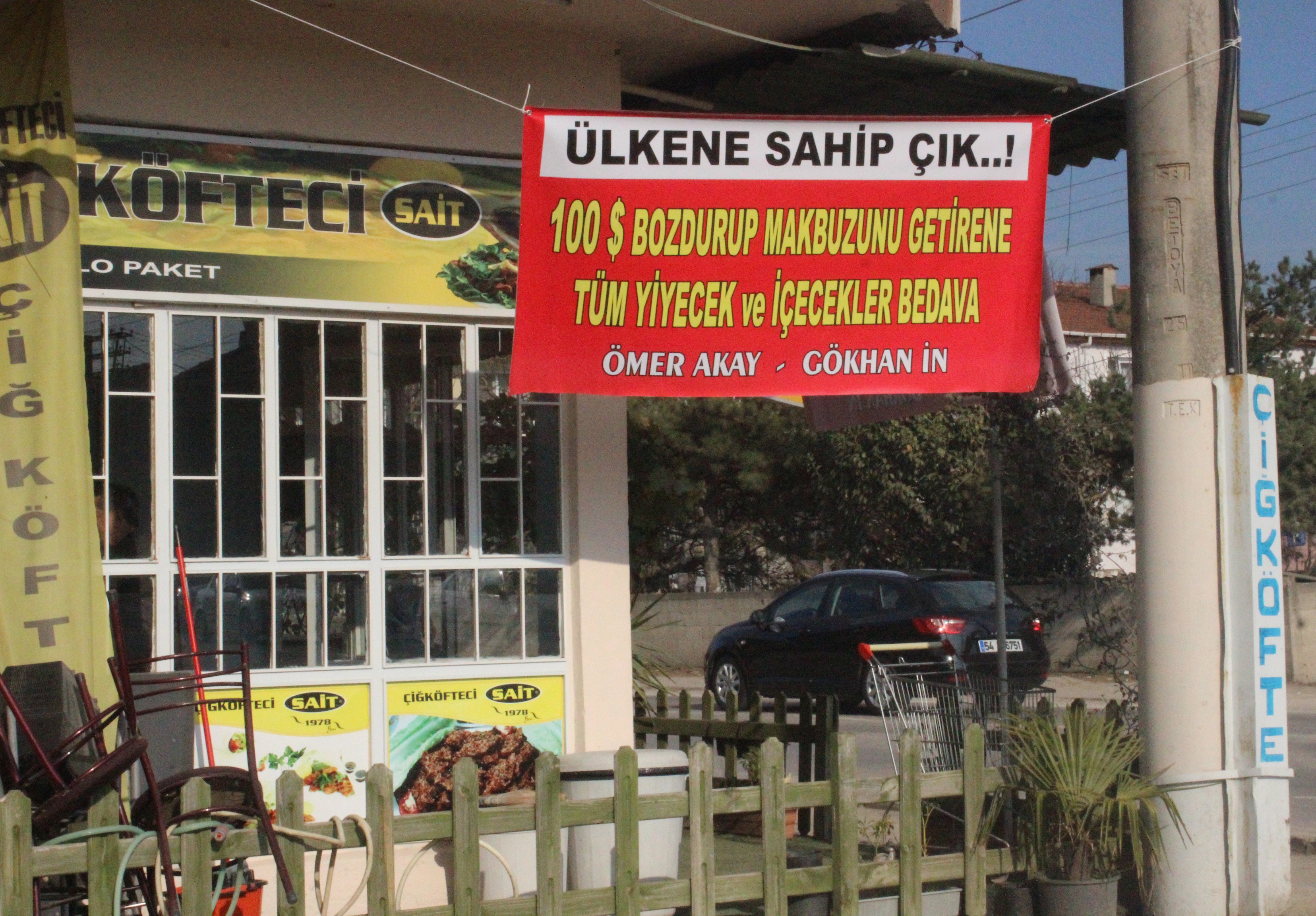 Cumhurbaşkanı Recep Tayyip Erdoğan'ın "Dolar ve Euro'larınızı bozdurun" çağrısına Türkiye’nin her ilinde olduğu gibi Sakarya’da da uyan esnaf, işyerlerinde çeşitli kampanyalar başlattı. Adapazarı’nda emlak ve inşaat firması ile birlikte aperatif salonu sahibi Gökhan İn, emlak ve inşaat firmasında 5 bin dolar bozdurup makbuzunu getirenden komisyon almayacaklarını, aperatif salonunda ise 100 dolar bozdurup makbuzunu getirene tüm yiyecek ve içeceklerin ücretsiz olduğunu duyurdu.