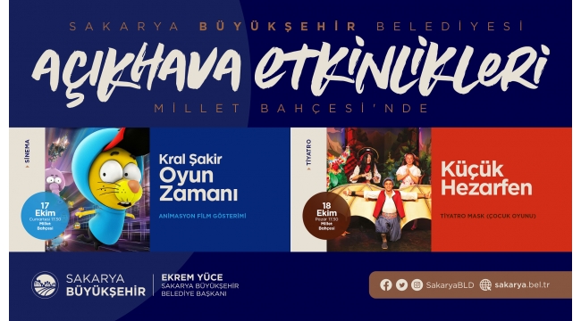 Sakarya Büyükşehir Belediyesi Kültür ve Sosyal İşler Dairesi Başkanlığı tarafından düzenlenen Açık Hava Etkinlikleri devam ediyor. Millet Bahçesi’nde 17 Ekim Cumartesi günü saat 17.30’da ‘Kral Şakir Oyun Zamanı’ animasyon film gösterimi, 18 Ekim Pazar günü ise yine 17.30’da Tiyatro Mask tarafından sahnelenen Küçük Hezarfen isimli çocuk oyunu minik izleyicilerin beğenisine sunulacak.Açık havada kültür sanatKültür ve Sosyal İşler Dairesi Başkanlığı’ndan yapılan açıklamada, “Açık havada gerçekleştirdiğimiz kültür sanat etkinlikleri devam ediyor. Maske, mesafe ve hijyen kuralları çerçevesinde yapılacak programlarımıza tüm minikleri davet ediyoruz” denildi.
