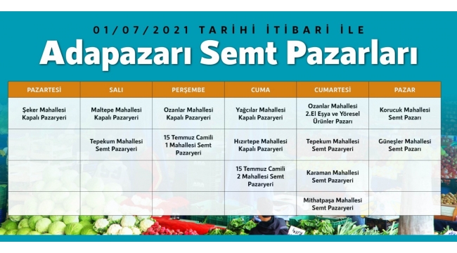 Bu doğrultuda 1 Temmuz tarihinden sonra hizmet verecek olan pazar yerleri şu şekilde: Pazartesi: Şeker Mahallesi Kapalı Pazar Yeri, Salı: Maltepe Mahallesi Kapalı Pazar Yeri. Perşembe: Ozanlar Mahallesi Kapalı Pazar Yeri, 15 Temmuz Camili 1 Mahallesi Semt Pazar Yeri Cuma: Yağcılar Mahallesi Kapalı Pazar Yeri, Hızırtepe Mahallesi Kapalı Pazar Yeri, 15 Temmuz Camili 2 Mahallesi Semt Pazar Yeri. Cumartesi: Tepekum Mahallesi Semt Pazar Yeri, Ozanlar Mahallesi 2. El Eşya ve Köy Ürünleri Pazarı, Karaman Mahallesi Semt Pazar Yeri, Mithatpaşa Mahallesi Semt Pazar Yeri, Pazar: Korucuk Mahallesi Semt Pazarı ve Güneşler Mahallesi Semt Pazarı.