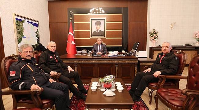 Afet ve Acil Durum Yönetimi Başkan Yardımcısı İsmail Palakoğlu, Sivil Savunma Daire Başkanı Sadi Ergin ve İl Afet ve Acil Durum Müdürü Hüseyin Kaşkaş, Vali Ahmet Hamdi Nayir’i ziyaret etti.