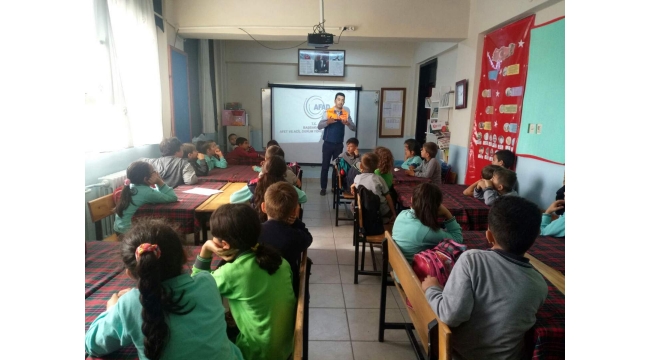 Afete Hazır Türkiye kapsamında 'Temel Afet Bilinci' eğitimleri kapsamında öğrencilere, olası afet ve acil durumlarda neler yapılması gerektiği Afet ve Acil Durum Yönetimi Başkanlığı (AFAD) eğitmenleri tarafından öğretiliyor.