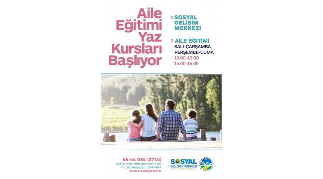 Büyükşehir Belediyesi Aile Eğitimi Yaz Kursları başlıyor. Sosyal Hizmetler Dairesi Başkanı Davut Yüce, Akyazı, Geyve ve Merkez Sosyal Gelişim Merkezlerinde yürütülecek olan Aile Eğitimi Yaz Kurslarına tüm vatandaşları davet etti.