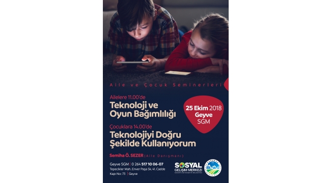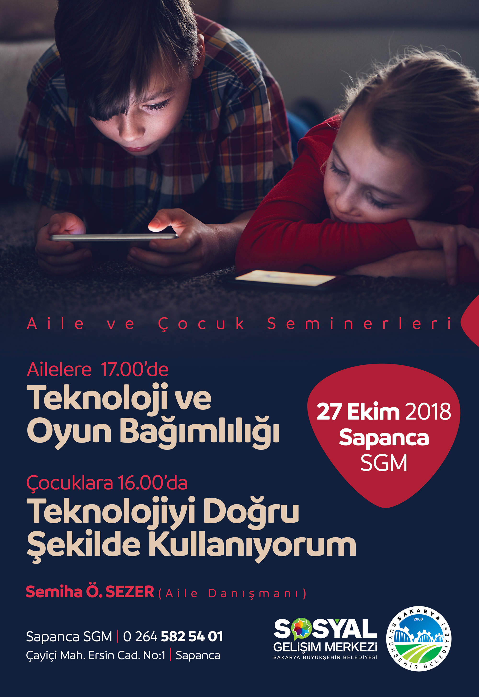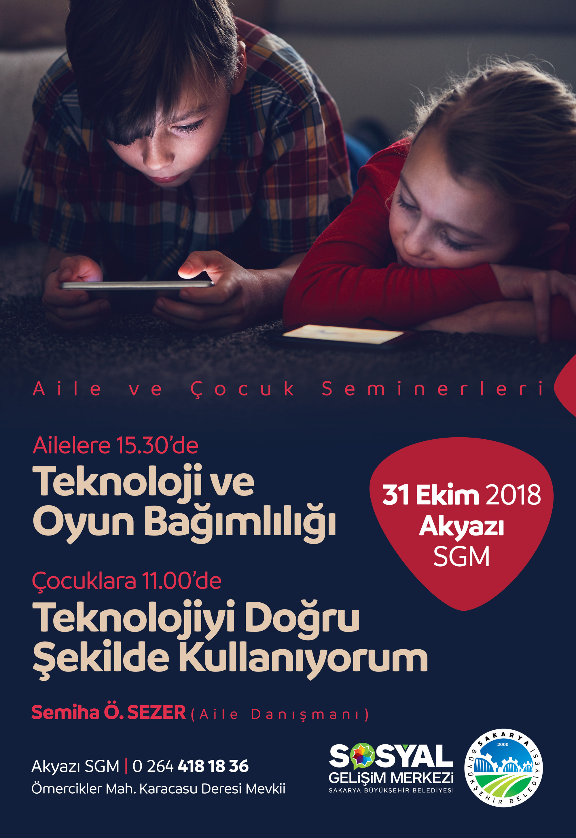 Sakarya Büyükşehir Belediyesi sosyal hizmetler dairesi başkanlığı Aile ve Çocuk Hizmetleri Şube Müdürlüğü bünyesinde gerçekleştirilen Aile ve Çocuk seminerleri devam ediyor. Her ayın son haftasında yapılan seminerler farklı konularda tüm SGM’lerde yapılıyor. Ekim ayının seminer konusu ‘Teknoloji Bağımlılığı’ Teknolojinin bilinçli kullanımının anlatılacağı seminer, Sosyal Gelişim Merkezi Aile Danışmanı Semiha Özgür SEZER tarafından gerçekleştirilecek. Teknoloji bağımlılığıEkim ayında gerçekleşecek seminer hakkında bilgiler veren Murat Kıroğlu, “Toplumumuzun önemli yapıtaşı olan aileyi güçlendirmek ve çocuklarımızın doğru yetişmesine katkı sağlamak amacıyla birçok projeyi hayata geçiriyoruz. Aile ve Çocuk seminerleriyle de ailelere ihtiyacı olan konularda doğru bilgileri sunmayı, bilinçli ebeveynleri topluma kazandırmayı amaçlıyoruz. Ekim ayında Teknoloji Bağımlılığı’nı ele alacağız. Teknolojinin bilinçli kullanımını anlatacağımız seminerlerimize tüm velilerimiz ve öğrencilerimiz davetlidir” ifadelerine yer verdi. Seminer programı şu şekilde: Geyve / 25 Ekim Perşembe:Teknoloji ve Oyun Bağımlılığı (Veliye Yönelik) Saat 11.00Teknolojiyi Doğru Şekilde Kullanıyorum (Öğrenciye Yönelik) Saat 14.00 Sapanca / 27 Ekim Cumartesi:Teknoloji ve Oyun Bağımlılığı (Veliye Yönelik) Saat 17.00Teknolojiyi Doğru Şekilde Kullanıyorum (Öğrenciye Yönelik) Saat 16.00 Akyazı / 31 Ekim Çarşamba:Teknoloji ve Oyun Bağımlılığı (Veliye Yönelik) Saat 11.00Teknolojiyi Doğru Şekilde Kullanıyorum (Öğrenciye Yönelik) Saat 14.00