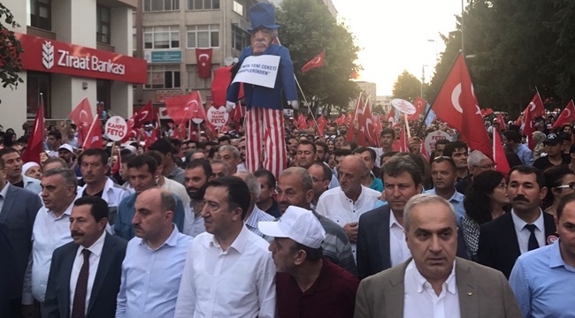 15 Temmuz darbe girişiminin birinci yıl dönümünde sakarya Demokrasi Meydanı doldu taştı. Sakarya halkı genciyle yaşlısıyla adeta yine destan yazdı. AK Parti Sakarya İl Gençlik Kolları Başkan Yardımcısı, Siyasi ve Hukuki İşler Başkanı Murat Salih Başer; FETÖ'nün geçen yıl 15 temmuz gecesi yaptığı hainliği unutmayacaklarını, hiçbir zaman da unutturmayacaklarına dair söz verdiklerini söyledi. Nöbetlerimizi evimiz kabul ettiğimiz çadırlarımızda tutuyoruz.Alandaki kalabalığın da bu hainliğin unutulmadığını gösterdiğini belirten Başer, "Rabbim 15 Temmuz'da yaşadığımız felaketi, acıyı bu millete bir daha yaşatmasın. Temennimiz bu. Bu millet için kanı, canını feda eden şehitlerimize, kahraman gazilerimize 15 Temmuz sonrası söz vermiştik. Bu sözü hep birlikte yerine getirmenin azim ve kararlılığını taşıyoruz ve daima taşıyacağız. Biz unutmadık, unutturmadık, unutturmayacağız. Bunun içinde çadırlarımızı Gar Meydanı’na kurduk ve nöbetlerimizi evimiz kabul ettiğimiz çadırlarımızda 5 gece boyunca tuttuk." dedi. Amerikan Kuklası FETÖ’nün Yeni Ceketi SahiplerindenAK Parti Sakarya İl Gençlik Kolları, "Benim hiç 2 ceketim olmadı" yalanını söylemesi ve tansiyon aletiyle yabancı basına fotoğraf vererek demagoji yapması çok konuşulan FETÖ elebaşının kuklasını yaptı. Maşası olduğu Amerikan bayrağının renklerinde kıyafeti, kolunda meşhur tansiyon aleti ve sahiplerinden kendisine giydirilen Amerikan bayrağı renklerindeki yeni ceketinden oluşan “FETÖ kuklası” kuklayı ve kendisini bir türlü iade etmeyen kuklacıyı bir kez daha herkese hatırlattı. “FETÖ kuklasının” Halk Yürüyüşü boyunca ve Demokrasi Meydanı’nda vatandaşların sert tepkileri ve bedduaları ile karşı karşıya kalması halkın bu terör örgütü elebaşına ve mensuplarına kinini bir kez daha gözler önüne serdi.