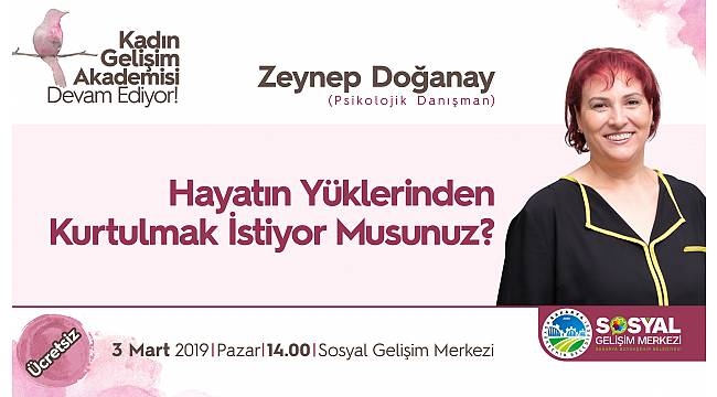 Büyükşehir Belediyesi Kadın Gelişim Akademisi’nde eğitimler devam ediyor. 3 Mart Pazar günü ‘Hayatın Yüklerinden Kurtulmak İstiyor Musunuz?’ konulu konferans ile devam edecek. Program saat 14.00’da SGM’de gerçekleştirilecek.