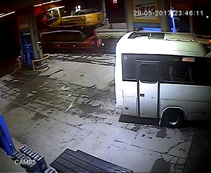 kaza anı ise akaryakıt istasyonunun güvenlik kamerası tarafından görüntülendi. Görüntülerde, iş makinesi yüklü tırın akaryakıt istasyonuna geliş anı ve istasyonun tavanına çarparak durma anı görülüyor.