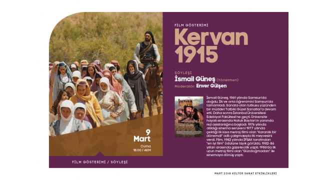 Sakarya Büyükşehir Belediyesi Mart Kültür Sanat Etkinlikleri film gösterimi ve söyleşi ile devam edecek. Kültür ve Sosyal İşler Dairesi Başkanlığı’ndan yapılan açıklamada, “Mart Kültür Sanat Etkinliklerimiz Kervan 1915 filminin gösterimi ve ardından gerçekleştirilecek söyleşi ile devam edecektir. Moderatörlüğünü Enver Gülşen’in üstleneceği programa Yönetmen İsmail Güneş konuk olarak katılacak. 9 Mart Cuma günü AKM’de gerçekleştirilecek etkinlik saat 18.00’da başlayacak. Programımıza tüm kültür sanat dostları davetlidir” ifadelerine yer verildi.