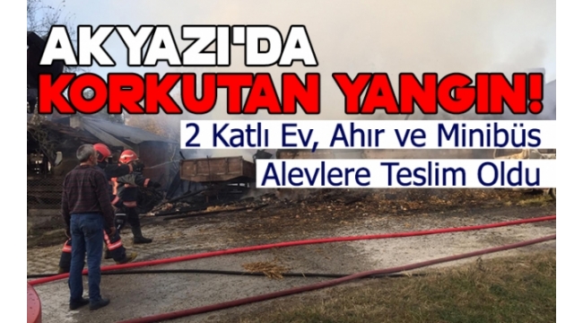 Akyazı ilçesinde 2 katlı bir ev, ahır, samanlık ve park halindeki bir minibüs yandı.