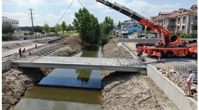 Sebahattin Zaim Bulvarı'ndan Serdivan’a geçişleri sağlayacak projede köprü kirişleri monte ediliyor. Süleyman Binek Caddesi’ne bağlantıyı sağlayacak arterde de SASKİ marifetiyle yağmursuyu çalışmaları sürdürülüyor. Yeni köprü ve duble yol projesi tamamlandığında Yazlık Kavşağı’nda zaman zaman yaşanan araç yoğunluğu azalacak. Sakarya Büyükşehir Belediyesi tarafından Sebahattin Zaim Bulvarı’ndan Serdivan’a geçişleri sağlayacak projede köprü kirişleri ekipler tarafından yerleştiriliyor. 25 metre uzunluğa 18 metre genişliğe sahip olacak köprünün yüzde 90’lık kısmı tamamlanırken, bölgede hayata geçirilecek duble yolda da SASKİ marifetiyle yağmursuyu altyapısı inşa ediliyor. Köprü kirişleri tamamlanıyorKonuyla ilgili yapılan açıklamada Sebahattin Zaim Bulvarı’ndan Serdivan’a geçişleri sağlayacak köprü ve duble yol projesi ile Yazlık Kavşağı’nda pik saatlerde yaşanan trafik yoğunluğunun azalacağına dikkat çekilerek, “Araç köprüsünün kirişleri ekiplerimiz tarafından yerleştiriliyor. Aynı zamanda yaya ve bisiklet geçişleri için de inşa edilen altgeçit de sona geldik. Hasır Sokak üzerinden Süleyman Binek Caddesi’ne bağlantıyı sağlayacak arterde de SASKİ marifetiyle yağmursuyu altyapısı inşa ediliyor. Ardından duble yol haline gelecek ve araç ile Serdivan’a ulaşımlar kolaylıkla yapılacak. Şehrimize hayırlı olmasını diliyoruz” denildi.