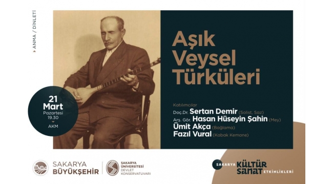 Sakarya Büyükşehir Belediyesi Kültür Sanat Etkinlikleri, alanında usta isimlerin katıldığı birbirinden değerli programlara ev sahipliği yapmaya devam ediyor. 21 Mart Pazartesi günü gerçekleştirilecek ‘Aşık Veysel Türküleri’ adlı programda Türkiye’nin usta ismi Aşık Veysel eserleriyle hatırlanacak. Anma ve dinleti programında sazda Doç. Dr. Sertan Demir, meyde Arş. Gör. Hasan Hüseyin Şahin, bağlamada Ümit Akça, kabak kemanede ise Fazıl Vural yer alacak. AKM’de gerçekleştirilecek etkinlik saat 19.30’da başlayacak. Kıymetli eserlerin seslendirileceği programa tüm vatandaşlar davet edildi.