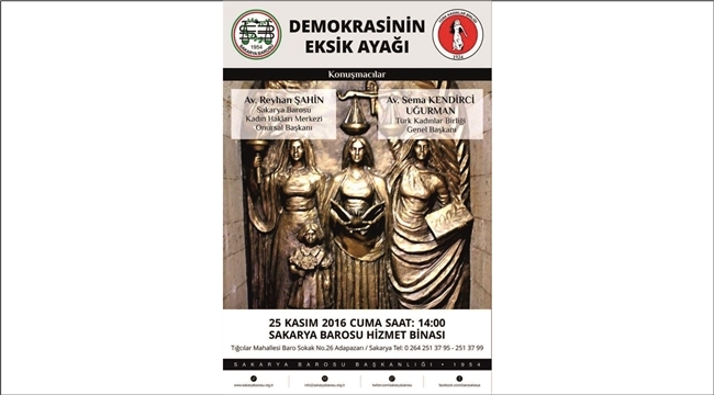 25 Kasım Cuma günü Sakarya Barosu ve Türk Kadınlar Birliği ortak organizasyonu ile “Demokrasinin Eksik Ayağı” konulu panel düzenleniyor.