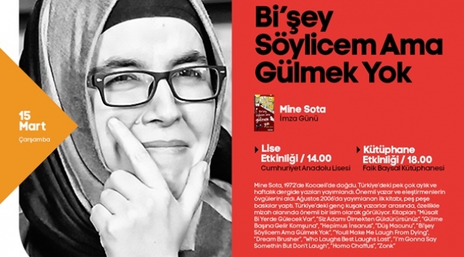 Sakarya Büyükşehir Belediyesi Mart Kültür Sanat Etkinlikleri, 15 Mart Çarşamba günü gerçekleştirilecek ‘Bi’şey Söylicem Ama Gülmek Yok’ kitabının söyleşi ve imza günü programı ile devam edecek. Yazar Mine Sota’nın kaleme aldığı bi’şey söylicem ama gülmek yok isimli eser iki farklı yerde konuşulacak. İlk olarak saat 14.00’da Cumhuriyet Anadolu Lisesi öğrencileriyle bir araya gelecek olan Sota, saat 18.00’da Faik Baysal Kütüphanesi’nde kültür sanat dostları ile buluşacak. Kültür ve Sosyal İşler Dairesi Başkanlığı’ndan yapılan açıklamada, “Yazar Mine Sota’nın Bi’şey Söylicem Ama Gülmek Yok kitabının konuşulacağı söyleşi ve imza günü etkinliğimize tüm kültür sanat dostları davetlidir” denildi.