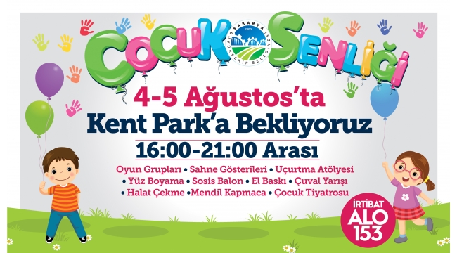 Sakarya Büyükşehir Belediyesi Halkla İlişkiler Şube Müdürlüğü tarafından düzenlenecek olan ‘Çocuk Şenliği’ 4 Ağustos Cumartesi ve 5 Ağustos Pazar günleri saat 16.00 ile 21.00 arasında Kent Park’ta çocuklarla buluşacak. Konu ile ilgili açıklamalarda bulunan Halkla İlişkiler Şube Müdürü Taha Toplu, çocukların unutamayacağı bir şenlik düzenleyeceklerini belirtti. Tebessüm olmaya geliyoruzToplu, “Kent Park’ta gerçekleştireceğimiz şenlikte birçok oyun grubunu ve eğlenceli etkinlikleri çocuklarımızla buluşturacağız. Oyun Grupları, Sahne Gösterileri, Uçurtma Atölyesi, Tohum Atölyesi, Geri Dönüşüm Atölyesi, Yüz Boyama, Sosis Balon, El Baskısı, Çuval Yarışları, Halat Çekme, Mendil Kapmaca ve Goncagül Tiyatrosu gibi birçok etkinlikte miniklerimizin yüzünde tebessüm olmaya geliyoruz. Etkinlikte şehrin tüm çocuklarını aramızda görmek isteriz” ifadelerini kullandı.