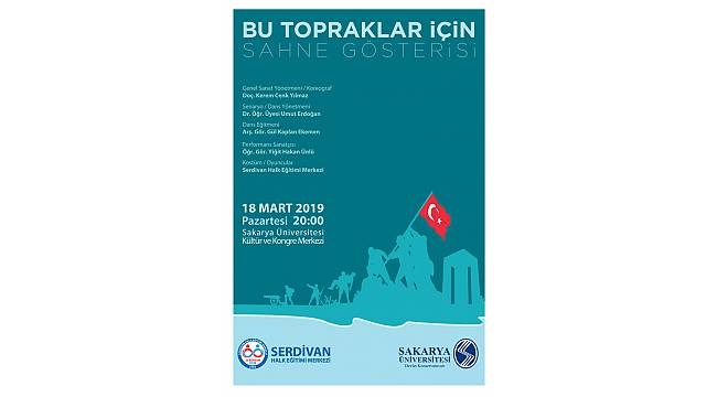18 Mart Şehitleri anma programı çerçevesinde Serdivan Halk Eğitimi Merkezi ve Sakarya Üniversitesi’nin iş birliği ile düzenlediği “Bu topraklar için” sahne gösterisi 18 Mart Pazartesi günü Sakarya Üniversitesi Kültür ve Kongre Merkezi’nde saat 20:00’de sahnelenecek.