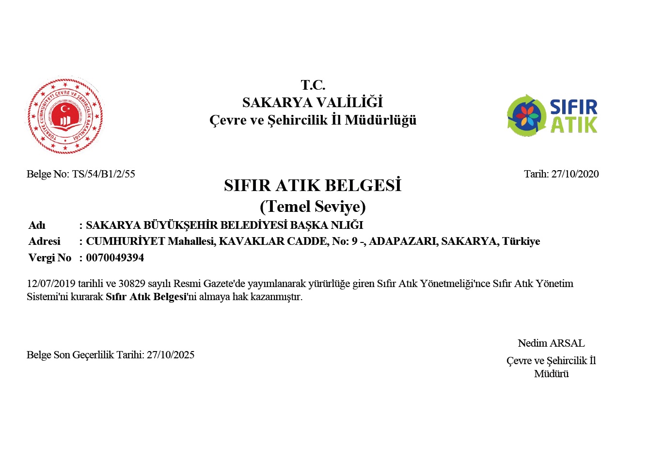 Büyükşehir Belediyesi Sıfır Atık Belgesi almaya hak kazandı. Gelecek nesillere daha yaşanılabilir ve temiz bir Sakarya bırakabilmek için sıfır atık uygulamalarını büyük bir hassasiyetle yürüten Büyükşehir Belediyesi, Temel Seviyede Sıfır Atık Belgesi için yönetmelikte yer alan gerekli kriterleri sağladı.