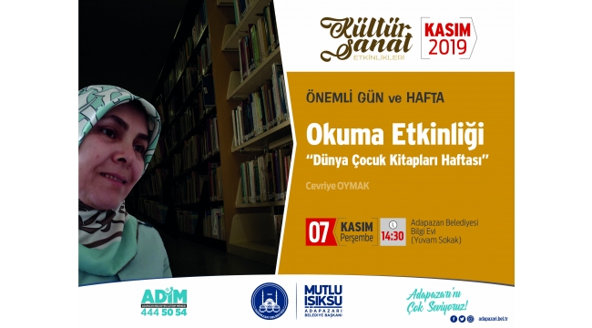 Adapazarı Belediyesi Kasım ayı Kültür Sanat programları, çocuk edebiyatının Sakaryalı yazarı Cevriye Oymak’ın okuma etkinliği ile devam edecek. Oymak, Dünya Çocuk Kitapları Haftası kapsamında, 7 Kasım Perşembe günü saat 14.30’da Merkez Bilgi Evi’nde kitapseverlerle buluşacak.