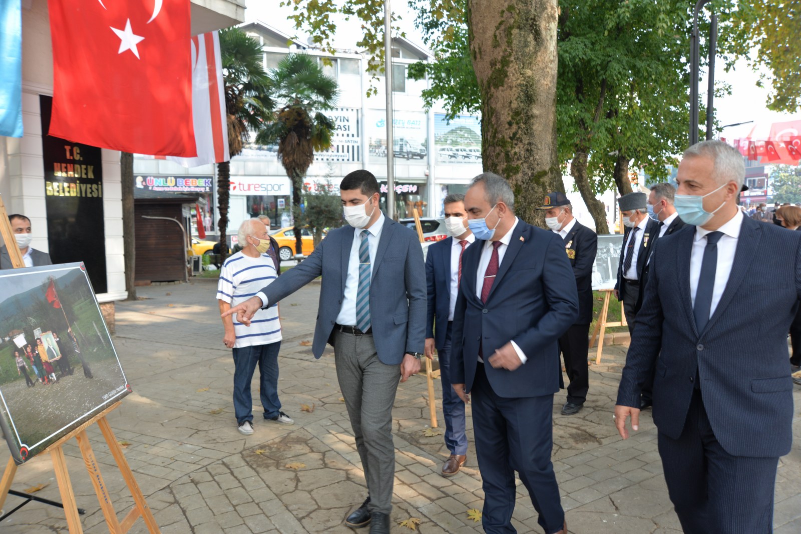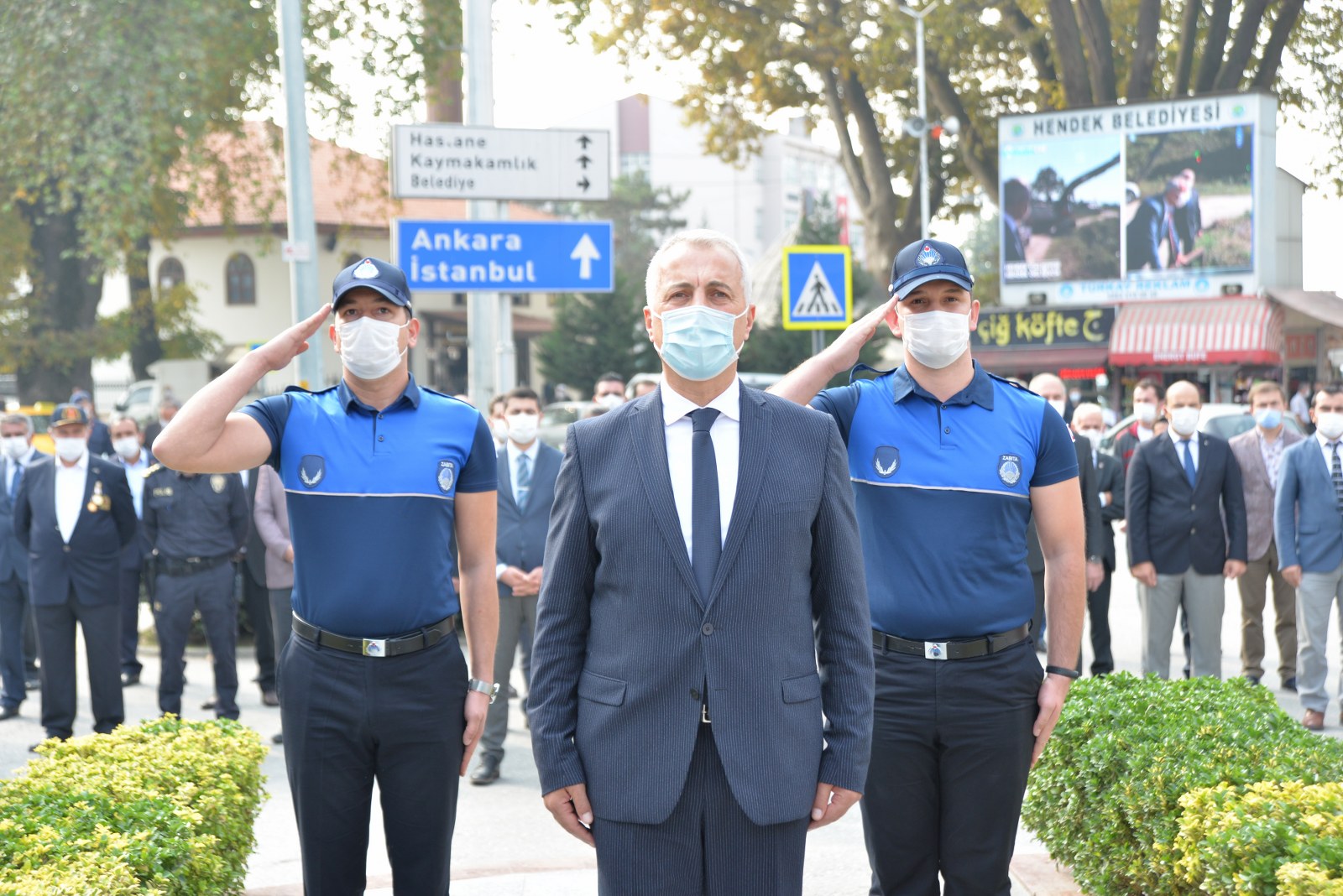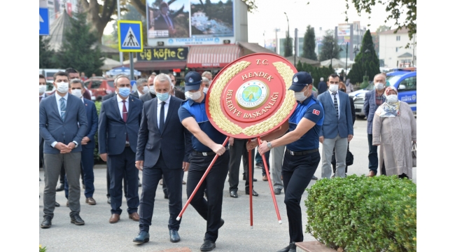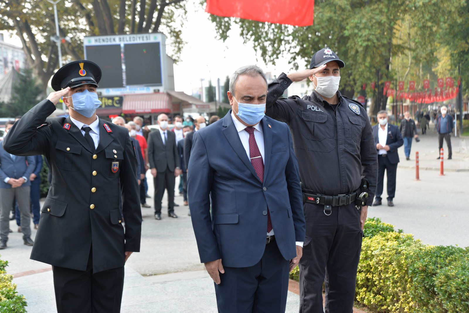SALGIN TEDBİRLERİ Koronavirüs tedbirleri kapsamında düzenlenen törene Hendek Kaymakamı Halil İbrahim Acır, Hendek Belediye Başkanı Turgut Babaoğlu, Cumhuriyet Savcısı Sebahattin Erkaya İlçe Jandarma Komutanı Teğmen Hasan Alataş, İlçe Emniyet Müdürü Şevket İlhan, askeri erkan, emniyet teşkilatının mensupları, gaziler, siyasi partilerin ilçe başkanları, kurum müdürleri, bürokratlar katıldı. Atatürk Anıtına çelenk sunulmasının ardından İstiklal Marşı okundu ve saygı duruşunda bulunuldu.ATATÜRK VE CUMHURİYET Törenin ardından Kaymakam Acır, Başkan Babaoğlu, Cumhuriyet Savcısı Sebahattin Erkaya İlçe Jandarma Komutanı Teğmen Hasan Alataş Emniyet Müdürü Şevket İlhan ve protokol, belediye binası önündeki Muammer Sencer Caddesinde açılan Cumhuriyet ve Atatürk konulu sergiyi gezdi. Cumhuriyetimizin kuruluşu, Atatürk ve milli mücadele dönemini anlatan fotoğrafların bulunduğu sergi ilçe protokolünün yanı sıra vatandaşlar tarafından büyük beğeniyle karşılandı. Sergi bugün 20.00’ye, 29 Ekim günü de herhangi bir hava muhalefeti olmaması durumunda yine aynı saate kadar gezilebilecek.
