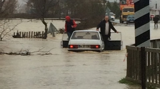 Sakarya’nın Kaynarca ilçesinde bir otomobil derenin taşması sonucu köprüde biriken suda mahsur kaldı. Otomobilde kurtarılmayı bekleyen 2 kişi traktörle kurtarıldı.