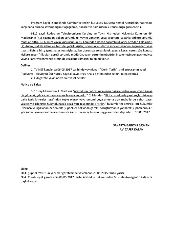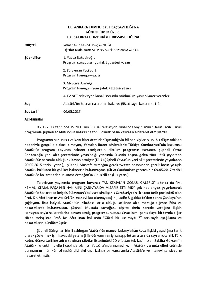 sakarya barosu olarak suç duyurusunda bulunuyoruz...!”AHLAKSIZCA Gelişmelerin ardından Sakarya Cumhuriyet Başsavcılığına sunulan suç duyurusunda, Türkiye Cumhuriyetinin Kurucusu Mustafa Kemal Atatürk’ü itibarsızlaştırmaya yönelik, ahlaksızca iftiralar atan program yapımcıları ve kanal yöneticileri hakkında,”Atatürk’ün hatırasına alenen hakaret etmek” suçu ile cezalandırılması talep edildi.