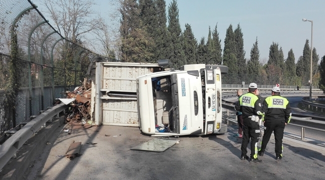 Edinilen bilgiye göre, Vasfi İkinci (52) idaresindeki 54 YE 129 plakalı hurda yüklü kamyon, tem bağlantı yolunda sürücüsünün direksiyon hakimiyetini kaybetmesi sonucu devrildi. Çevredeki sürücülerin haber vermesiyle kaza yerine gelen 112 Acil Servis ekipleri, hafif yaralanan sürücüye ayakta müdahalede bulundu.