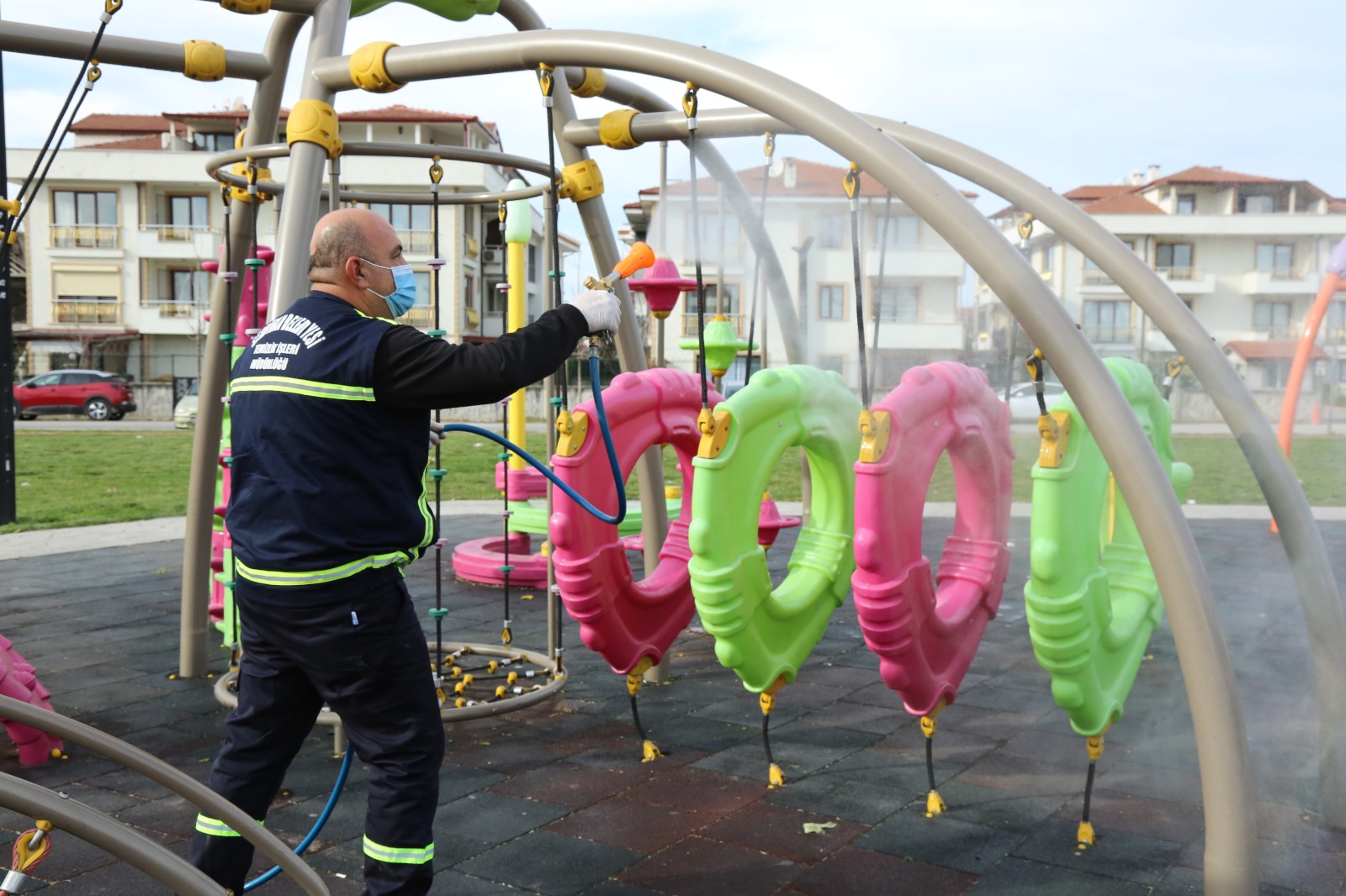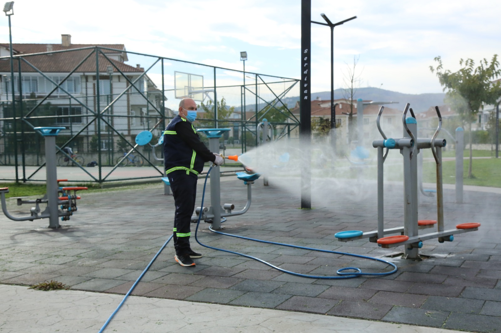Kısıtlama günlerinde cadde ve sokakların boş olmasını fırsat bilen ekipler ilçe genelindeki tüm cadde ve sokakları her hafta ilaçlı suyla yıkayarak dezenfekte ediyor. Bunun yanı sıra hafta içi yoğun olarak kullanılan resmi kurumların çevrelerinde de aynı şekilde temizlik ve dezenfekte çalışması yapılıyor. Temizlik ekipleri hafta içi serbest zamanlarda vatandaşlar tarafından yoğun olarak kullanılan parkları da ilaçlayarak dezenfekte ediyor. Çocuk oyun gurupları ve fitness aletleri tek tek temizlenerek Sağlık Bakanlığı onaylı dezenfektanlarla ilaçlanıyor.