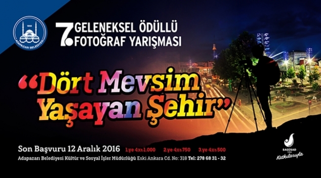 Kültür ve Sosyal İşler Müdürlüğü’nün geleneksel olarak düzenlediği yarışmanın bu yılki konusu“Dört Mevsim Yaşayan Şehir” olacak. sakarya İli ve Adapazarı İlçesi sınırlarında çekilme şartı aranan fotoğraflar jüri tarafından değerlendirilerek ödüllendirilecek. Yarışmacıların en fazla 4 fotoğrafla katılabileceği yarışmayla ilgili bilgi veren Kültür ve Sosyal İşler Müdürü Özkan Gümülcineli, “Bu yıl ilimizin 4 mevsimde yaşadığı güzellikleri anlatacak bir konu seçtik. Fotoğrafçı gözüyle ilimizin mevsim güzellikleri anlatılacak. Her yarışmacının dört mevsimden fotoğraf gönderme zorunluluğu bulunmamaktadır. Konumuz 4 mevsim Sakarya olduğu için her dalda 4 birinci, 4 ikinci, 4 üçüncü olacak. Birinci gelenlere 1000 TL, ikinci gelenlere 750 TL, Üçüncü gelen yarışmacılara ise 500 TL ödül verilecek. Başvurular 12 Aralık 2016 tarihine kadar devam edecek.12 ARALIK SON BAŞVURUYarışmaya katılmak isteyenler, Sakarya sınırları içinde çekilmiş 4 mevsim yaşananları anlatan fotoğraflarla yarışmaya katılabilecek. Bir yarışması en fazla 4 fotoğrafla yarışmaya katılabilecek. Fotoğrafların baskıya hazır son halleri 12 sıkıştırma kalitesinde, 300 dpi olarak baskı kadrajında, üzerinde rumuz ve sıra no yazılı CD içine kaydedilecek. CD ile birlikte katılım formu bir zarfa koyulup, üzerlerine sadece rumuz yazılarak teslim edilecek. Başvurular 12 Aralık 2016 tarihine kadar Güneşler’de bulunan Adapazarı Belediyesi Kültür ve Sosyal İşler Müdürlüğü’ne yapılacak. Yarışmayla ilgili bilgi almak isteyenler 278 6831 nolu telefondan detaylı bilgi alabilecek.