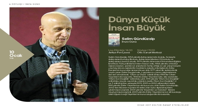 Sakarya Büyükşehir Belediyesi Ocak kültür sanat Etkinlikleri ‘Dünya Küçük İnsan Büyük’ konulu söyleşi ve imza günü programı ile devam edecek. 10 Ocak Salı günü ilk olarak saat 14.00’da Arifiye Fen Lisesi öğrencileriyle bir araya gelecek olan Selim Gündüzalp, günün bir diğer etkinliğinde saat 19.00’da Ofis Sanat Merkezi’nde sevenleri ile buluşacak. Kültür ve Sosyal İşler Dairesi Başkanlığından yapılan açıklamada, “Tüm hemşerilerimiz programlarımıza davetlidir” denildi.
