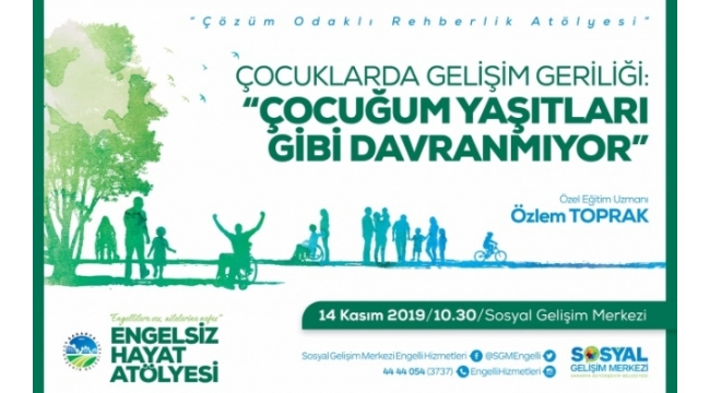 Büyükşehir Belediyesi tarafından düzenlenen Engelsiz Hayat Atölyesi’nde eğitimler devam ediyor. ‘Çocuklarda Gelişim Geriliği: Çocuğum Yaşıtları Gibi Davranmıyor” konulu seminer 14 Kasım Perşembe günü saat 10.30’da SGM’de gerçekleştirilecek.