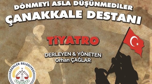 Çanakkale Zaferinin 102. Yıldönümü dolayısı ile erenler belediyesi tarafından “Dönmeyi Asla Düşünmediler Çanakkale Destanı” adlı tiyatro gösterisi programı düzenlendi.Erenler Belediyesi Kültür Merkezinde 17 Mart Cuma günü Saat19:30’da başlayacak olan programda 16 kişilik dev oyuncu kadrosu ile Çanakkale zaferi sahneye taşınacak.