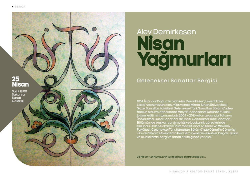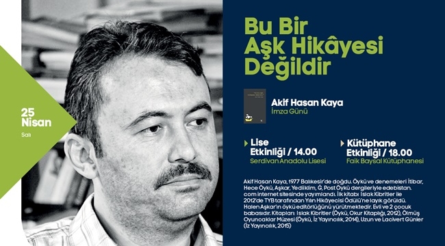 Sakarya Büyükşehir Belediyesi Nisan Kültür Sanat Etkinlikleri 25 Nisan Salı günü gerçekleştirilecek söyleşi/imza günü ve Geleneksel Sanatlar Sergisi programları ile devam edecek. Günün ilk etkinliğinde Yazar Akif Hasan Kaya, ‘Bu Bir Aşk Hikayesi Değildir’ konulu söyleşi ve imza günü programlarına katılacak. İlk olarak saat 14.00’da Serdivan Anadolu Lisesi’nde öğrencilerle bir araya gelecek olan Akif Hasan Kaya, saat 18.00’da ise Faik Baysal Kütüphanesi’nde sevenleriyle buluşacak. Sergi açılışıGünün bir diğer etkinliğine ise sakarya Sanat Galerisi ev sahipliği yapacak. Sanatçı Alev Demirkesen’in özgün eserlerinden oluşan ‘Nisan Yağmurları’ isimli Geleneksel Sanatlar Sergisi sanatseverlerin beğenisine sunulacak. Serginin açılışı 25 Nisan Salı günü saat 18.00’da gerçekleştirilecek. sergi 21 Mayıs Pazar gününe kadar Sakaryalılar tarafından ziyaret edilebilecek. Kültür ve Sosyal İşler Dairesi Başkanlığından yapılan açıklamada “Kültür-Sanat dolu geçecek Salı günü etkinliklerimize tüm Sakaryalıları davet ediyoruz” denildi.