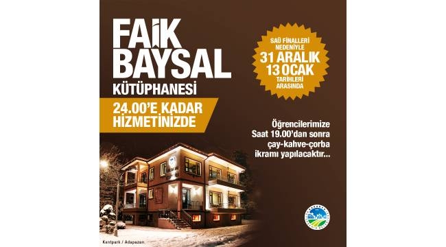 Adem Turhan, “Her yıl olduğu gibi bu yıl da örencilerimiz final sınavlarına faik baysal Kütüphanesinde hazırlanacak. Özellikle sınav dönemlerinde öğrencilerimizden kütüphane saatleriyle ilgili esnetme talebi alıyoruz. Daha önce de yapış olduğumuz gibi SAÜ final dönemde 31 Aralık Pazartesi ve 13 Ocak Pazar tarihleri arasında kütüphanemiz gece 24.00’a kadar hizmet sunacak. Ülkemizin geleceği sevgili gençlerimize çay, çorba, kahve ikramlarımız da olacak. Tüm öğrencilerimizi Faik Baysal Kütüphanesi’ne bekliyor; sınavlarında başarılar diliyoruz” diye belirtti.