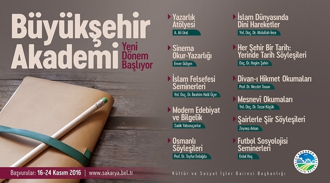 Sakarya Büyükşehir Belediyesi Kültür ve Sosyal İşler Dairesi Başkanlığı her yıl düzenli olarak gerçekleştirilen Büyükşehir Akademi’de bir ilke daha imza atıyor. Bu yıl 10 farklı başlıkta derslerin yer aldığı takvime son olarak ‘Futbol Sosyolojisi Seminerleri’ dersi de ilave edildi. Konuyla ilgili açıklamalarda bulunan Kültür ve Sosyal İşler Dairesi Başkanı İbrahim Aktürk, “İlk olarak 10 ders olarak belirlediğimiz Büyükşehir Akademi’ye ‘Futbol Sosyolojisi Seminerleri’ni de ekledik. Yeni Şafak Gazetesi Yazarı Erdal Hoş ve beraberindeki ünlü isimler futbolun sosyolojisini 16 hafta boyunca katılımcılarla paylaşacak. Tüm sporseverleri akademiye kayıt olmaya davet ediyoruz” diye konuştu. Kayıtlar devam ediyorAktürk, “Bilindiği üzere derslerimizi 16 haftaya çıkardık. Kayıtlarımızı da 16 Kasım Çarşamba günü başlatmıştık. 24 Aralık Perşembe gününe kadar devam edecek olan Büyükşehir Akademi kayıtlarına hemşerilerimizi davet ediyoruz. Akademiye kayıt olmak isteyenler işlemlerini kurumsal internet sayfamız (www.sakarya.bel.tr) üzerinden yapabilirler. Başvuruda yazılı mülakat geçerli olacaktır. Ders hocası yazılı mülakat sonucu derse öğrenci seçecektir” şeklinde konuştu. 11 farklı atölyeAktürk, “Yazarlık Atölyesi, İslam Dünyasında Dini Hareketler, Sinema Okur-Yazarlığı, Her Şehir Bir Tarih: Yerinde Tarih Söyleşileri, İslam Felsefesi Seminerleri, Divan-ı Hikmet Okumaları, Modern Edebiyat ve Bilgelik, Mesnevi Okumaları, Osmanlı Söyleşileri, Şairlerle Şiir Söyleşileri ve futbol Sosyolojisi Seminerleri başlıklarında 11 farklı dersimiz yer alacak. Birbirinden değerli konukların da yer alacağı akademi derslerimizde Şairlerle Şiir Atölyesinde 16 farklı şair eğitim sunacak. Sinema Okur-Yazarlığı derslerinde sinema tarihimizin önemli isimleri Semih Kaplanoğlu, Derviş Zaim, Leyla İpekçi, Mustafa Tatçı ve Zeynep Gemuhluoğlu gibi isimler de katılımcılarla buluşacak. Futbol Sosyolojisi Seminerlerinde ise Tarık Tufan, Mustafa Reşit Akçay, Fatih Tekke, Ergin Aslan gibi isimler yer alacak” ifadelerini kullandı.