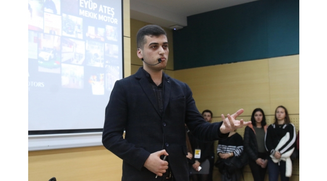 Oyuncaklardan profesyonelliğeİş hayatına atılma hikâyesini öğrencilerle paylaşan Eyüp Ateş, babasının mesleğinin tornacı olduğunu ve yedi yaşında babasının tornacı dükkânında çalışmaya başladığını anlattı. Ateş, “7 yaşında küçük bir torna atölyesinde kendi isteğimle çalışmaya başladım. Küçükken oyuncaklarla başlayan bir hikâye, beni profesyonelliğe kadar götürebildi. Ben üniversiteden önce mesleğime karar vermiştim. Yani sınav sonrası verilmiş bir karar değildi. Küçük yaştan beri projelere yönelik oluşan merakım benim çeşitli projelerde yer almamı sağladı. Küçüklüğümden beri hayalim Mekik Motorsan isimli bir şirket kurmaktı. Yaklaşık 6 yıl ön hazırlık yaptıktan sonra 9 aydır şirketimiz resmi olarak faaliyete devam ediyor” ifadelerini kullandı.Yerli CEO’lar için yerli üretim gerekYan sanayinin Türkiye’yi belli bir yere kadar götürdüğünü fark ettiğini söyleyen Ateş, “Bir ürün üreteceksem her parçasını ben yapmalıyım ve ihraç etmeliyim düşüncesiyle yola çıktım” dedi. Ateş, “Kendi ürünlerimizi üretip bunları ihraç edersek, hem biz hem de ülkemiz kazanır. Bizi yurt dışına tanıtacak en iyi nokta, yerli ürünleri üretip ihraç yapmak. Yerli üretimlerden haberdar olmadığımız için sadece yabancı ülkelerin yaptıklarını görüyoruz. Aslında biz de yapıyoruz ama birbirimizi desteklemiyoruz. Bana göre bizim yerli CEO’lar çıkarmamızın tek yolu yerli ürünler üretmekten geçiyor” diye konuştu.Sosyal avantaj kazandırıyorAile şirketinde çalışma hayatına adım attığını belirten Yenilik Makina Yöneticisi Yavuz Fettahoğlu da, ailesinin tüccar olması dolayısıyla şanslı olduğunu söyledi. Oto sanayide küçük bir dükkânları olduğunu, bu dükkânda makine ve yedek parça üretmeye çalıştıklarını anlatan Fettahoğlu, “Lise çağlarımdan itibaren orada çıraklık yapıyordum. Üniversitede gördüğünüz derslerin size bir katkısı yokmuş gibi görünebilir. Ama size müthiş bir sosyal avantaj kazandırıyor. Ben üniversiteyi bitirip aile işlerini devraldığımda olay bambaşka bir noktaya gitti. Çünkü burada edindiğiniz tecrübeler, sorunlara ürettiğiniz çözümler iş hayatına da yansıyor” şeklinde konuştu.İş hayatına yeni başlayacak öğrencilere de bazı tavsiyelerde bulunan Fettahoğlu, “En büyük sorunumuz enerji. Aranızda iş hayatına nereden başlayacağına karar veremeyen arkadaşlarımız vardır. Enerji gerçekten çok önemli ve ciddi açığın olduğu bir alan. Özellikle Türkiye gibi enerjiye muhtaç olan bir ülkede yapacağınız her işin ticari bir potansiyeli var. Dolayısıyla bu alana eğilmenizi öneririm” dedi.