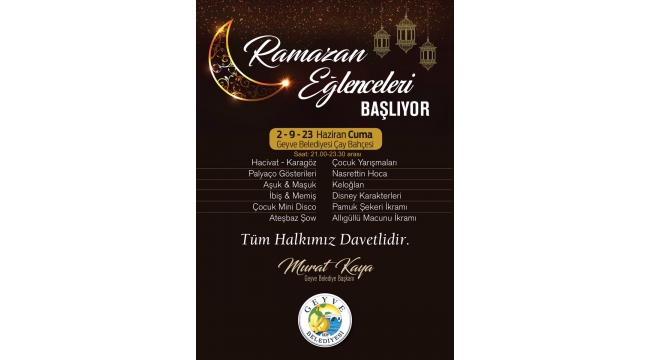 Bu Ramazanda Geyve’li çocuklar geyve Belediye Parkında kendileri için özel hazırlanan alanlarda Ramazan’ın neşesini doyasıya yaşayacak.Geyveli çoçuklarımız ile ailelerine yönelik Hacivat-Karagöz, Palyaço gösterileri, Çocuk yarışmaları, Aşuk-Maşuk, Keloğlan, Nasrettin Hoca, İbiş-Memiş, Disney karakterleri, Çoçuk mini disco, Ateşbaz Şhov gösterilerinin yer aldığı programlarda çocuklara Pamuk şekeri ve allıgüllü macunu ikramı yapılacak.Geyve Belediye Başkanı Murat Kaya;Geyve Belediyesi olarak bu yıl Geyve Belediye parkında çoçuklarımıza unutulmaz bir ramazan yaşatacağız. Ailelerimiz ve çocuklarımız gönüllerince eğlenecek. Hemşerilerimiz hem geçmiş Ramazanları yâd edecek hem de eğlenecek.Bu etkinliklerimize tüm ailelerimizi bekliyoruz.