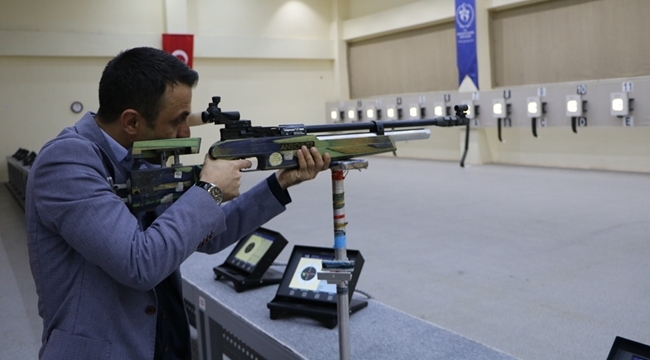 Son teknoloji ile donatılmış Atış Poligonunda antrenman yapan sporculardan , hedefe tam isabet.