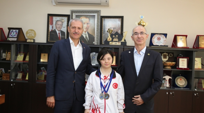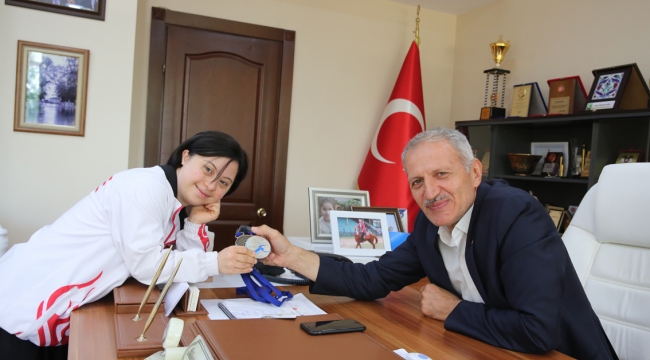 Kosova’da düzenlenen 1.Uluslararası Down Sendromlular Yüzme Şampiyonasında ülkemize 2 gümüş 1 bronz madalya kazandıran sakarya Zirve Özel Sporcular Spor Kulübü kurucu başkanı ve sporcusu Özel milli yüzücü Fatma Çağla Demir, Başkan Dişli’ye yaptığı ziyarette yüzmeyi çok sevdiğini ve yüzmeye erken yaşlarda başladığını söyledi.BABADAN DESTEK Yüzme konusunda en büyük desteği Babası Orhan Demir’den alan Çağla, antrenmanlara babasıyla katılıyor. Kızı Çağla’nın hem Babası hem antrenörü olan Orhan Demir, kızının başarılarında emeği olan Gençlik Spor İl Müdürü Fatih Çelikel ve onun nezdinde tüm personel ve yüzme hocalarına teşekkür etti. Ziyaretten duyduğu memnuniyeti ifade eden Başkan Dişli, gençlerin kendilerini daha iyi ifade edebilmeleri konusunda sporla mutlaka ilgilenmeleri gerektiğini belirterek, kazandığı başarılarından dolayı Fatma Çağla Demir’i ve spora teşvik ettiği için Baba Orhan Demir’i tebrik etti.Dişli, Çağla’nın spor azmiyle daha çok başarılara imza atacağına inandığını söyledi.
