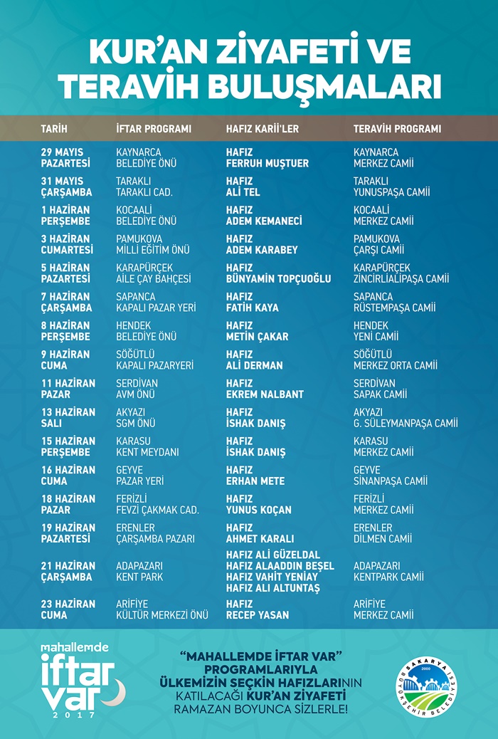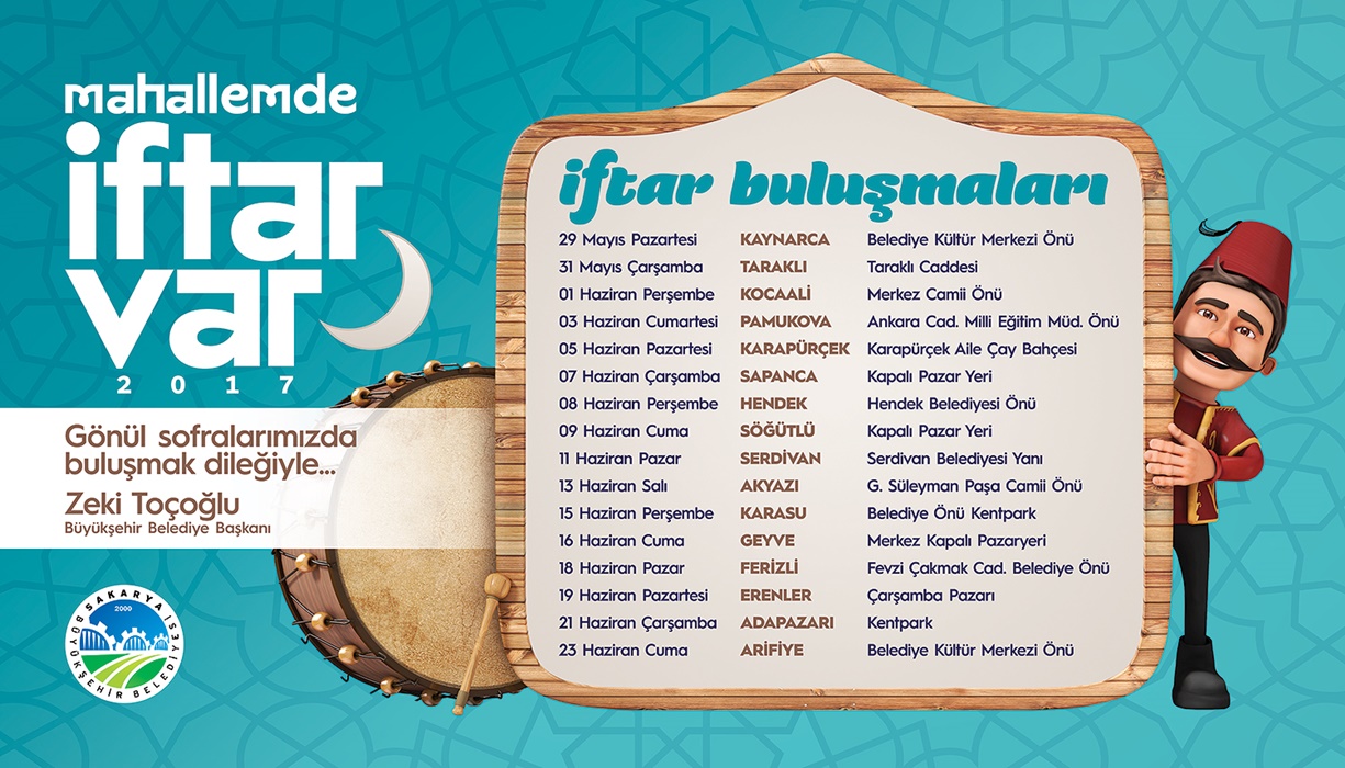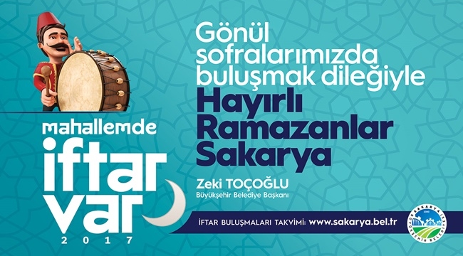 Sakarya Büyükşehir Belediyesi tarafından düzenlenen ‘Mahallemde İftar Var’ buluşmalarında program takvimi belirlendi. 16 ilçede vatandaşlar ile buluşacaklarını belirten Büyükşehir Belediye Başkanı Zeki Toçoğlu, “Ramazan Ayı’nın manevi huzurunu bu yıl da hep birlikte yaşayacak, hemşerilerimizle iftar sofralarında buluşacağız. İnşallah gönül sofraları birliğimize ve kardeşliğimize vesile olur. Mübarek ramazan Ayı’nın ülkemiz ve tüm İslam Âlemi’nin selameti için hayırlar getirmesini diliyor, tüm hemşerilerimizin Ramazan’ını tebrik ediyorum” diye konuştu. 16 İlçede İftar Sofraları16 ilçede kurulacak iftar sofraları ile ilgili detayları paylaşan Sosyal Hizmetler Dairesi Başkanı Davut Yüce ise, “Bu Ramazan Ayı’nda da 16 ilçemizde kuracağımız kardeşlik sofralarında hemşerilerimiz ile buluşacağız. Ramazan’ın manevi iklimine uygun buluşmalarımız da değerli hocalarımız da bizlerle olacak; Kur’an tilavetleriyle bizleri onurlandıracaklar. Mahallemde İftar Var buluşmalarımıza tüm hemşerilerimizi bekliyoruz. Bir kez daha vatandaşlarımızın Ramazan Ayını tebrik ediyoruz” ifadelerini kullandı. ‘Mahallemde İftar Var’ Programlarında takvim ise şöyle; 29 Mayıs Pazartesi Kaynarca Belediye Kültür Merkezi Önü 31 Mayıs Çarşamba Taraklı Taraklı Caddesi 1 Haziran Perşembe Kocaali Merkez Camii Önü 3 Haziran Cumartesi Pamukova Ankara Caddesi Milli Eğitim Müdürlüğü Önü 5 Haziran Pazartesi Karapürçek Karapürçek Aile Çay Bahçesi 7 Haziran Çarşamba Sapanca Kapalı Pazar Yeri 8 Haziran Perşembe Hendek Hendek Belediyesi Önü 9 Haziran Cuma Söğütlü Kapalı Pazar Yeri 11 Haziran Pazar Serdivan Serdivan Belediyesi Yanı 13 Haziran Salı Akyazı Gazi Süleyman Paşa Camii Önü 15 Haziran Perşembe Karasu Belediye Önü Kent Park 16 Haziran Cuma Geyve Merkez Kapalı Pazaryeri 18 Haziran Pazar Ferizli Fevzi Çakmak Caddesi Belediye Önü 19 Haziran Pazartesi Erenler Çarşamba Pazarı 21 Haziran Çarşamba Adapazarı Kent Park 23 Haziran Cuma Arifiye Belediye Kültür Merkezi Önü