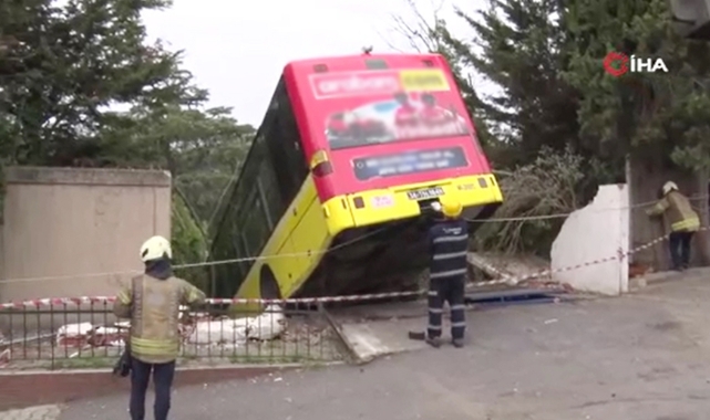 İstanbul Üsküdar Barbaros Mahallesi'nde sabah saatlerinde, yokuş aşağı seyir halindeyken freni patlayan İETT otobüsü, sürücüsünün kontrolünden çıkarak yolun sonunda bulunan istinat duvarına çarptı.OTOBÜS İSTİNAT DUVARINDA ASILI KALDIÇarpmanın etkisiyle duvarın bir bölümü yıkılırken otobüsün ön kısmı boşluğa asılı kaldı.