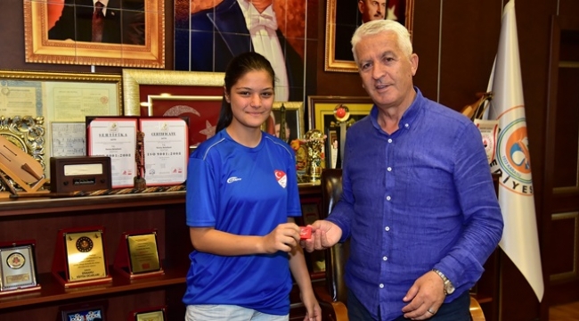 Sakaryaspor Bayan futbol Takımında kaleci olarak spor yaşantısını sürdüren Özlem Mina Eşkin, İstanbul’da yapılacak olan Türkiye Bayan Milli Futbol Takımı seçmelerine gitmeden önce karasu Belediye Başkanı Mehmet İspiroğlu’nu ziyaret etti. Okul ve spor yaşantısını aynı anda başarılı bir şekilde yürütmeyi başaran Özlem Mina Eşkin bu başarısından dolayı Başkan İspiroğlu tarafından altın ile ödüllendirildi.Milli Takım seçmelerine gitmeye hak kazanan Eşkin açıklamalarında şu ifadelere yer verdi; “Öncelikle derslerimde başarılı olmaya ardından da benim için olmazsa olmaz sporda başarı elde etmeye çalışıyorum. Spor yaşantımın ilk dönemlerindeyim. Bu yolda örnek aldığım iki spor aşığı insan var. Biri bana her konuda yardımcı olan, her anımda yanımda olan Babam Recep Eşkin diğeri ise Spora ve sporcuya her konuda yardım etme çabası içerisinde olan ve eskiden de spor ile iç içe büyümüş olan Karasu Belediye Başkanımız Sayın Mehmet İspiroğlu. Kendilerine sonsuz teşekkürlerimi sunuyorum” dedi.Ziyaret sonunda kendisi ile hatıra fotoğrafı çektiren Özlem Mina Eşkin’e başarılar dileyen Karasu Belediye Başkanı Mehmet İspiroğlu; “Her an spor ile iç içe yaşayan bir topluluğuz. Karasu’da, sporun her dalında başarı gösteren bir ilçe konumunda. Bizler de geleceğimizin emanetçisi çocuklarımızı bu yönde ilerletmek için tüm imkânlarımızı onlara sunuyoruz. Derslerinde de başarılı olan kızımız Özlem Mina Eşkin’e Karasu’dan Milli Takıma uzanan yolda başarılar diliyorum” dedi.