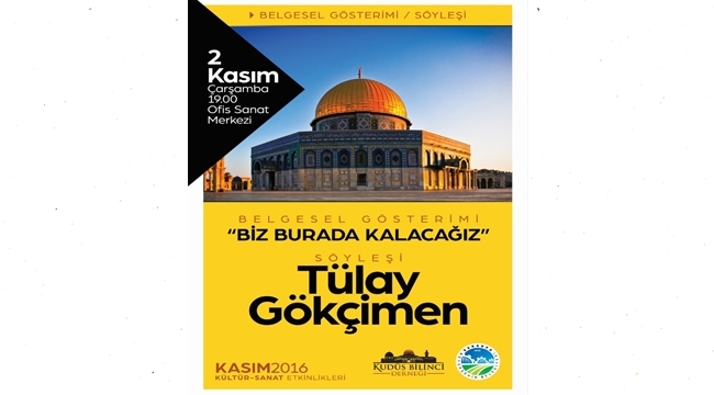 Sakarya Büyükşehir Belediyesi Kültür ve Sosyal İşler Dairesi Başkanlığı tarafından düzenlenecek Kasım kültür sanat Etkinlikleri başlıyor. Yapılan açıklamada, “Kültür ve Sosyal İşler Daire Başkanlığı ve Kudüs Bilinci Derneğinin ortaklaşa düzenleyeceği etkinlikte ‘Biz Burada Kalacağız’ belgeselinin gösterimi kültür sanat dostlarının beğenisine sunulacaktır. 2 Kasım Çarşamba günü, Ofis Sanat Merkezi’nde, saat 19.00’da başlayacak olan program, Filistin ve Kudüs davasını konu edinen belgesel gösteriminin ardından belgeselin yapımcısı Tülay Gökçimen’in söyleşisi ile devam edecektir. Programa tüm vatandaşlarımız davetlidir” denildi.