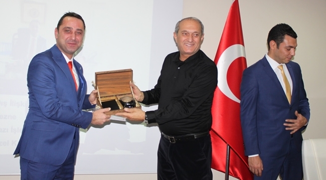 Foto 1: SESOB Başkanı Hasan Alişan, çalışmalarından ötürü Keser’e teşekkür ederek, hediye verdi.