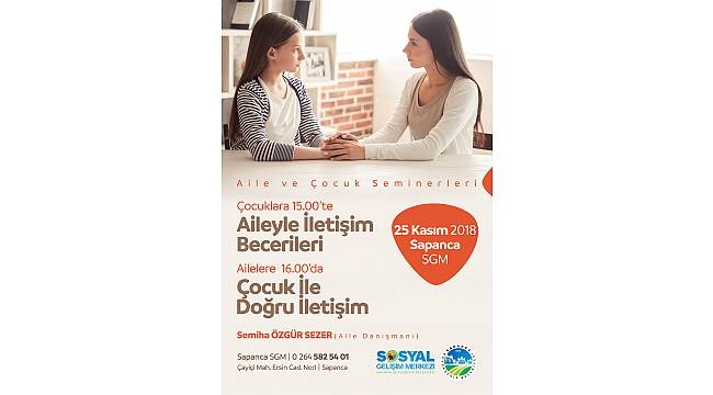 Sakarya Büyükşehir Belediyesi Sosyal Hizmetler Dairesi Başkanlığı aile ve Çocuk hizmetleri Şube Müdürlüğü tarafından düzenlenen Aile ve Çocuk Seminerleri devam ediyor. ‘Aile İçi İletişim’ konulu seminer Sapanca, Akyazı ve Geyve SGM’de gerçekleştirilecek. SGM Aile Danışmanı Semiha Özgür Sezer konuşmacı olarak katılacak.