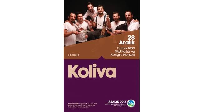Sakarya Büyükşehir Belediyesi Aralık Kültür Sanat Etkinlikleri, 28 Aralık Cuma günü gerçekleştirilecek ‘Koliva’ konseri ile sona erecek. 2018 kültür sanat etkinliklerinin son konseri Koliva, 28 Aralık Cuma günü saat 19.00’da SAÜ Kültür ve Kongre Merkezi’nde gerçekleştirilecek. Kültür ve Sosyal İşler Dairesi Başkanlığı’ndan yapılan açıklamada, “28 Aralık Cuma günü Karadeniz müziğinin sevilen gruplarından Koliva’yı misafir edeceğimiz konser etkinliğimizin biletleri tükendi. Etkinliğimize katılacak olan tüm kültür dostlarına teşekkürlerimizi sunuyoruz” denildi.