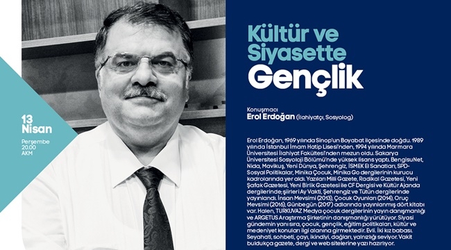 Sakarya Büyükşehir Belediyesi Nisan Kültür Sanat Etkinlikleri, 13 Nisan Perşembe günü ‘Kültür ve Siyasette Gençlik’ isimli konferans ile devam edecek. AKM’de 20.00’da gerçekleştirilecek olan programa Erol Erdoğan konuşmacı olarak katılacak. Kültür ve Sosyal İşler Dairesi Başkanlığı’ndan yapılan açıklamada, “Kültür ve Siyasette Gençlik’ konulu konferansımıza tüm kültür sanat dostları davetlidir” ifadelerine yer verildi.