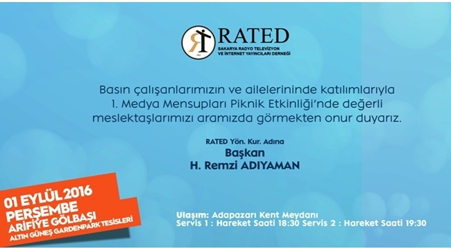 RATED 1. Medya Mensupları piknik Etkinliği 1 Eylül Perşembe günü Arifiye Gölbaşı Altın Güneş Garden Park Tesislerinde gerçekleşiyor. Piknik organizasyonuna basın çalışanları ve aileleri katılıyor. Piknik için Adapazarı Kent Meydanından saat 18.30 ve 19.30’da servisler kaldırılacaktır. Piknik boyunca ikramlar ve çeşitli etkinlikler düzenlenecek. Ödüllü oyunlar, müzikler ve çeşitli etkinliklerle basın çalışanları ve aileleri yoğun ve stresli geçen yaz döneminin yorgunluğunu bu piknikte atacaklar.Medyayı piknikte buluşturmak istediklerini söyleyen RATED Yönetim Kurulu Başkanı Remzi Adıyaman, tüm basın çalışanları ve ailelerini pikniğe davet etti. Adıyaman, “Basın çalışanlarımızı ve ailelerini Perşembe günü organize edeceğimiz Medya Mensupları Piknik Etkinliğine davet ediyorum. Meslektaşlarımızı bu piknikte bir arada görmek bizleri mutlu edecektir” dedi.
