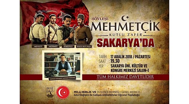 TRT’de yayınlanan Mehmetçik Kutlu Zafer dizisinin oyuncuları ve senarist-yapımcısı Mehmet Bozdağ Söyleşi için Sakarya Üniversitesinde Sakaryalılarla buluşacak.