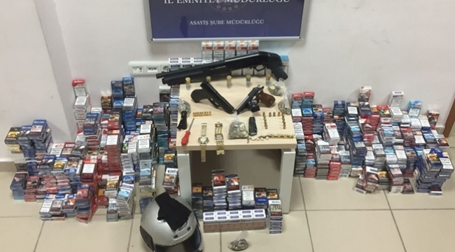 Edinilen bilgilere göre, yüzlerine motosiklet kaskı takarak hırsızlık yapan şahıslar, Arifiye ve Serdivan ilçesinde toplam bin 300 TL ile 14 bin TL’lik sigara çalarak kayıplara karıştı. Olay yerinde inceleme yapan Sakarya İl Emniyet Müdürlüğü Asayiş Şube Müdürlüğü Hırsızlık Büro Amirliği ekipleri, hırsızlık olayını gerçekleştirenlerin; M.T., K.D., Y.T., E.Y., İ.H., isimli şahıslar olduğunu tespit etti. M.T., K.D., E.Y., İ.H., isimli şahıslar hırsızlık olayından kısa süre sonra polis ekiplerince kıskıvrak yakalanarak gözaltına alındı. Y.T. isimli şahıs ise daha sonra metruk bir bina içerisinde yakalanarak gözaltın alındı. Polis ekipleri olay yerinde yaptığı aramada 1 adet Magnum marka pompalı tüfek, 5 adet fişek, 1 adet Valther 7.65 mm çaplı tabanca ve tabancaya ait içerisinde 8 adet fişek bulunan şarjör, 1 adet el feneri, 1 adet tornavida ele geçirdi.